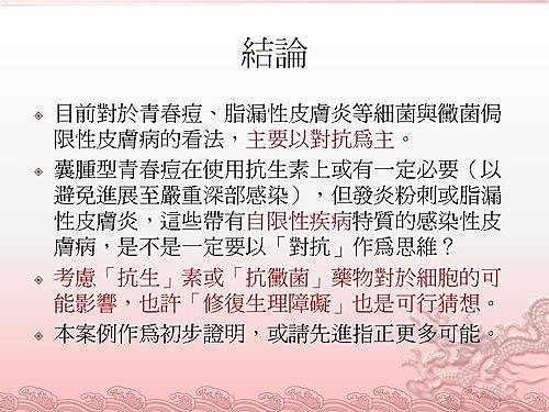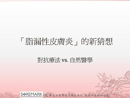 深秋/初冬的現在是脂漏性皮膚炎的好發期。飽受脂漏性皮膚炎困苦的朋友也許可以考慮:從自然醫學談脂漏性皮膚炎、脂漏性皮膚炎的自癒現象與格友的脂漏性皮膚炎經驗分享三篇文章。案例其實很多,只是臨床繁忙,沒有太多時間整理。