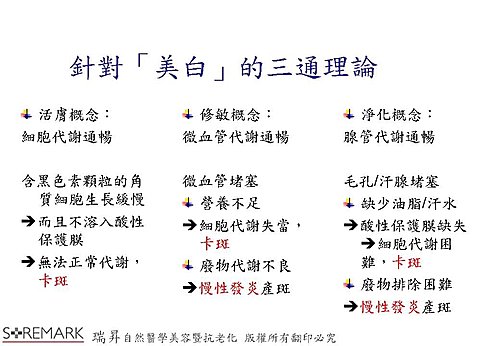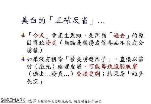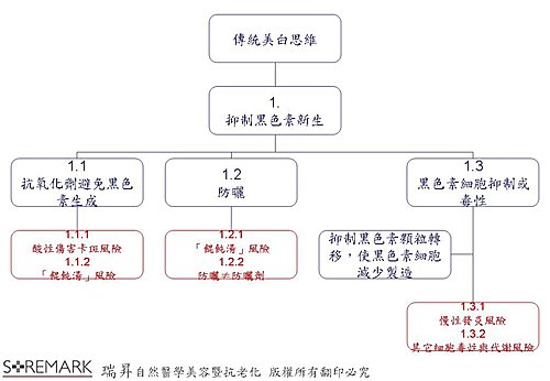 關於「美白」這個題目,一般保養品思維限定在「黑色素生成抑制」領域,醫療思維則鎖定於「已生成之黑色素破壞」與「已生成之黑色素還原成無色酪氨酸」兩部分。少數的保養品可能思考到「不讓黑色素顆粒轉移給角質細胞,從而降低黑色素生成量」這種舊領域的新想法。